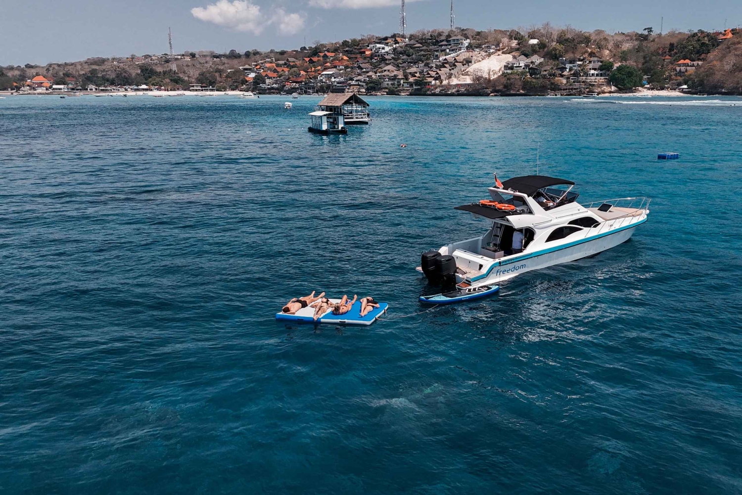 Tag på en luksuriøs sejltur ved solnedgang i Nusa Dua, hvor dit eventyr begynder med en varm velkomst om bord på en fantastisk yacht. Mens I sætter sejl, kan I nyde den betagende udsigt over Balis uberørte kystlinje. Din første aktivitet er koralfiskeri; kast snøren ud, og prøv lykken med at fange livlige tropiske fisk, guidet af en erfaren besætning. Derefter kan du nyde spændingen ved at stå på paddleboard på det rolige, krystalklare vand eller slappe af på en flydende madras og lade de blide bølger lulle dig ind i en tilstand af lykke. Når solen begynder sin nedstigning, forvandles himlen til et lærred af strålende farver, der danner den perfekte baggrund for din rejse. Nyd et udvalg af lækre snacks og forfriskende drikkevarer, der serveres på dækket, og som gør dit afslappede krydstogt endnu bedre. Yachtens rummelige dæk giver rigelig plads til at slappe af, uanset om du slapper af i solen eller nyder skyggen. Når solen går ned og skaber et fascinerende gyldent skær i horisonten, kan du tage fantastiske billeder til minde om denne uforglemmelige oplevelse. Den rolige atmosfære kombineret med de luksuriøse faciliteter og den opmærksomme service sikrer en mindeværdig aften på vandet. Når yachten vender tilbage til havnen, vil du tage den fredfyldte skønhed ved Balis kystlinje og glæden ved et perfekt solnedgangscruise med dig, hvilket gør dette til en oplevelse, du vil huske for evigt.Includes