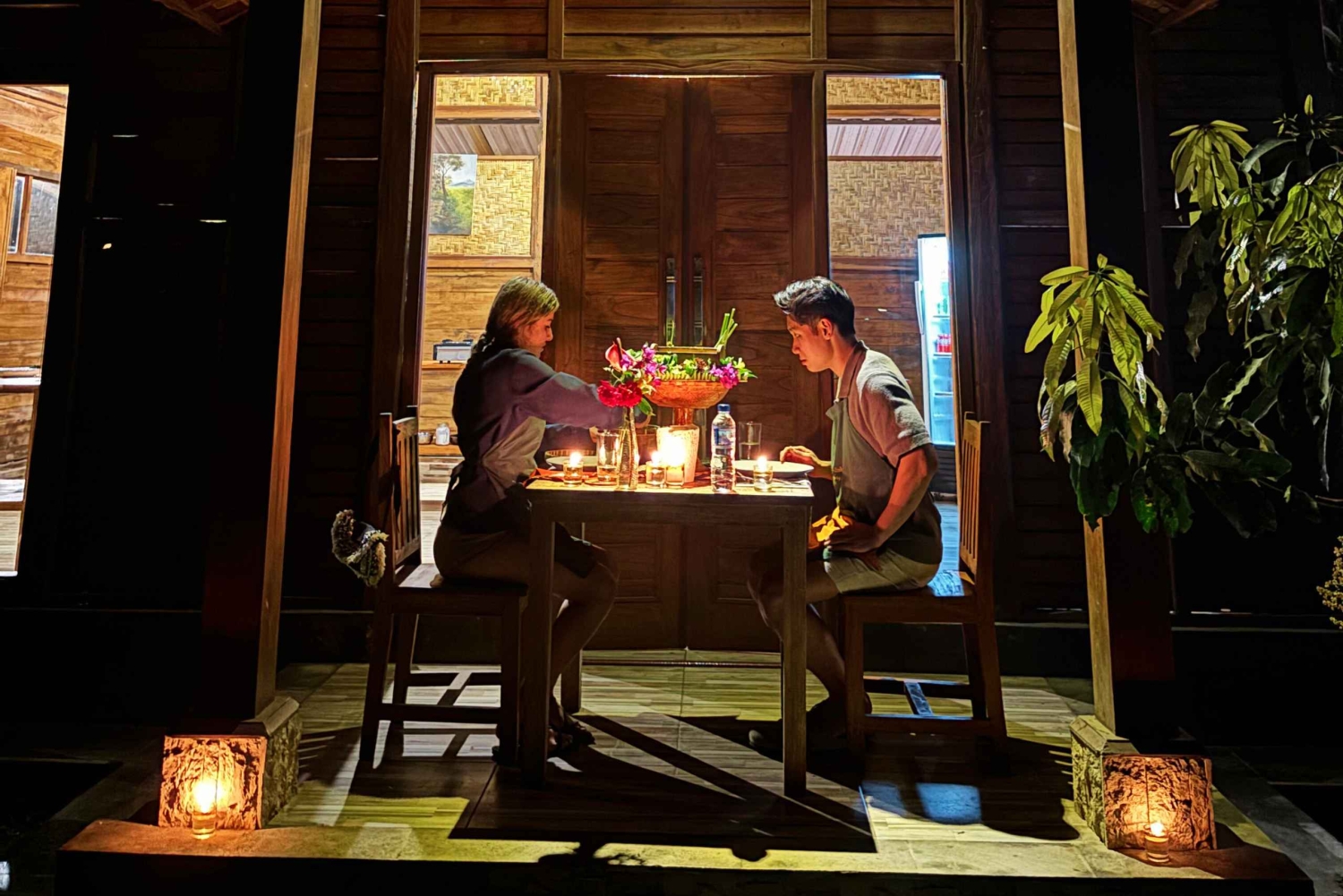 Slip væk fra folkemængderne, og nyd en magisk aften i junglen. Høst økologiske ingredienser i tusmørket, og lav en autentisk balinesisk 6-retters middag. Nyd dit festmåltid under stjernerne i et udendørskøkken.