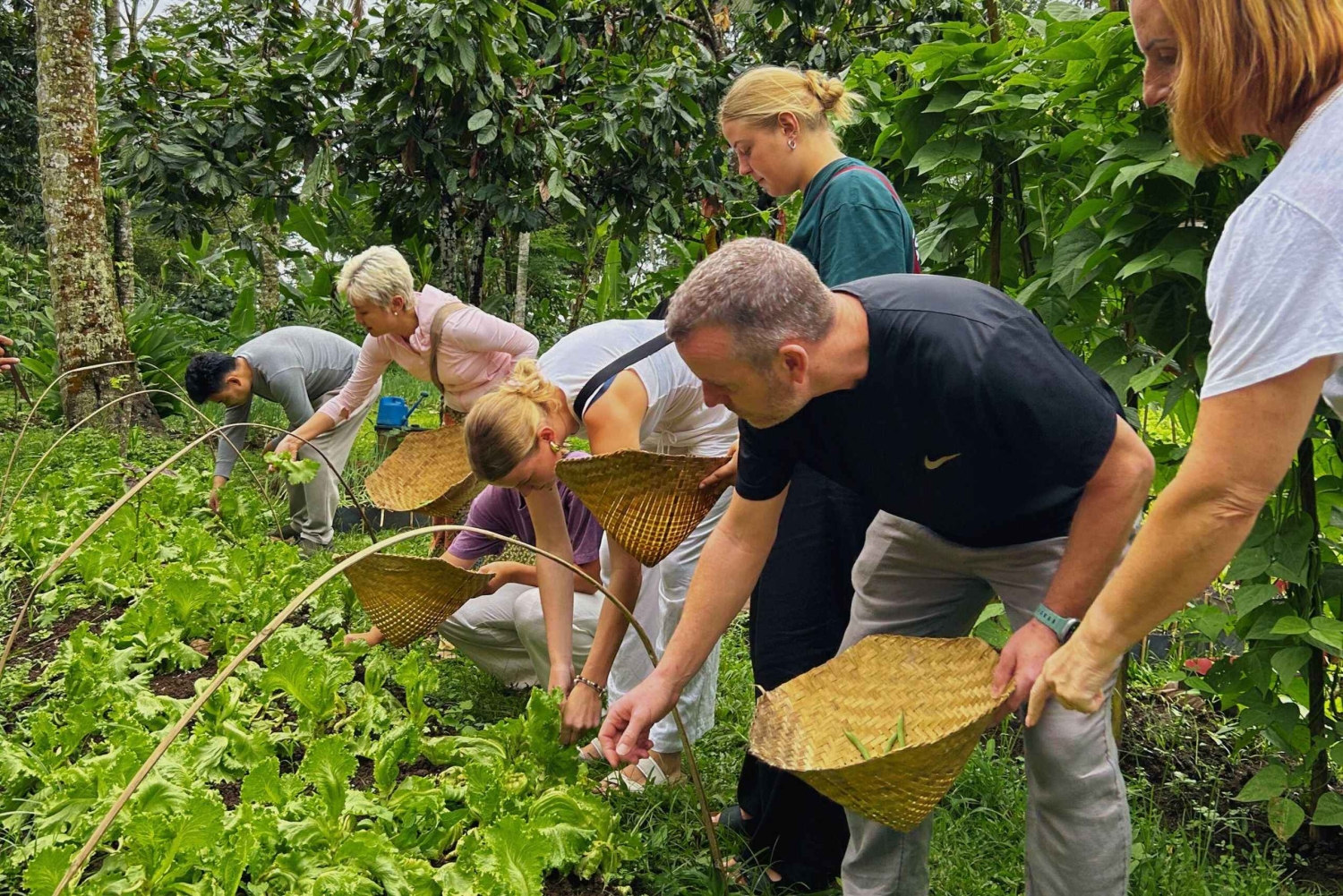 Slip væk fra varmen og travlheden i det centrale Ubud, og nyd en rolig aften i Taro-højlandet. Din kulinariske rejse begynder med en bekvem afhentning fra mødestedet i Ubud kl. 16.00. Når du forlader byen, vil du mærke, at luften bliver køligere og atmosfæren roligere. Når du ankommer til Taman Dukuhs økologiske gård, bliver du budt velkommen med varm balinesisk kaffe eller te, mens solen begynder at gå ned over landsbyen. Du bliver guidet af din ekspertkok og udforsker den frodige økologiske ejendom for at lære hemmelighederne bag bæredygtigt balinesisk landbrug. Dette er en ægte oplevelse fra jord til bord: Du håndplukker dine egne friske råvarer – såsom lange bønner, chili og citrongræs – direkte fra kilden. I det bløde lys sidst på eftermiddagen forbinder denne høst dig dybt med jorden og den mad, du skal til at skabe. Træd ind i vores traditionelle udendørskøkken for at få et praktisk madlavningskursus. Vi mener, at mad smager bedst, når den er frisk, så vi følger en unik 'Lav mad-Spis-Lav mad-Spis'-stil. Du kværner krydderier til Base Gede (krydderipasta), tilbereder dine forretter og sætter dig ned for at nyde dem med det samme, mens de er varme og sprøde. Det afslappede tempo giver dig mulighed for at sludre med din kok og dine medrejsende uden at føle, at du bliver forhastet. Du vender derefter tilbage til din station for at tilberede hovedretterne og desserten. Aftenen kulminerer i en storslået middag i familiestil. Nyd det 6-retters festmåltid, du har skabt – uanset om du har valgt den almindelige, vegetariske eller veganske menu – omgivet af naturens symfoni. Nyd lyden af fårekyllinger og frøer og andre naturlyde i løbet af natten. Det er den perfekte blanding af en lærerig workshop og en kulturel middag på landet.Includes
