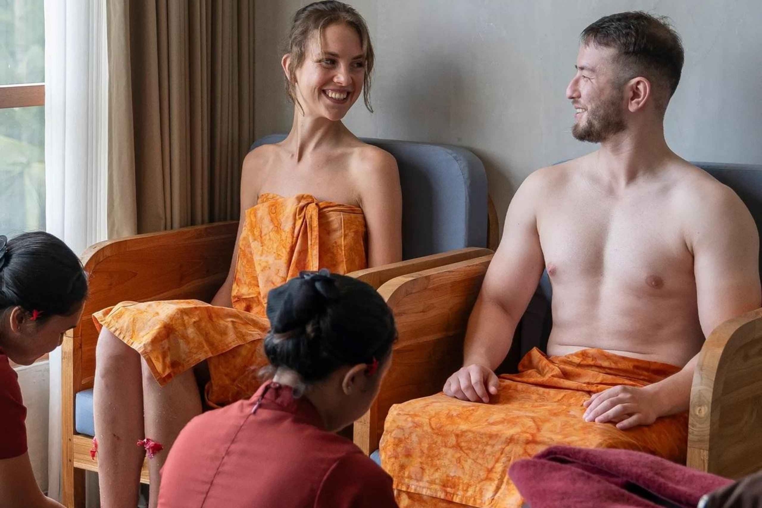 Escápate del bullicio de Ubud y sumérgete en el ambiente tranquilo de Tejas Spa Emana. Este tratamiento relajante combina técnicas balinesas tradicionales con una serena vista a los arrozales que calma la mente y el cuerpo. Comienza tu experiencia con el masaje Akatara, una terapia exclusiva que utiliza largos movimientos rítmicos y una suave presión para liberar la tensión muscular y restablecer el equilibrio energético. Los terapeutas expertos utilizan una mezcla de aceites naturales para calmar tu cuerpo, dejando tu piel suave y fresca. Continúa con un lujoso baño de flores, bellamente dispuesto con pétalos de colores y con vistas a los arrozales. Respira los aromas, relájate en el agua tibia y deja que el paisaje sereno complete tu momento de pura relajación. Esta experiencia es perfecta para parejas o viajeros solos que buscan un ritual de spa rejuvenecedor rodeado de la belleza de la naturaleza: una escapada de bienestar verdaderamente balinesa.Includes