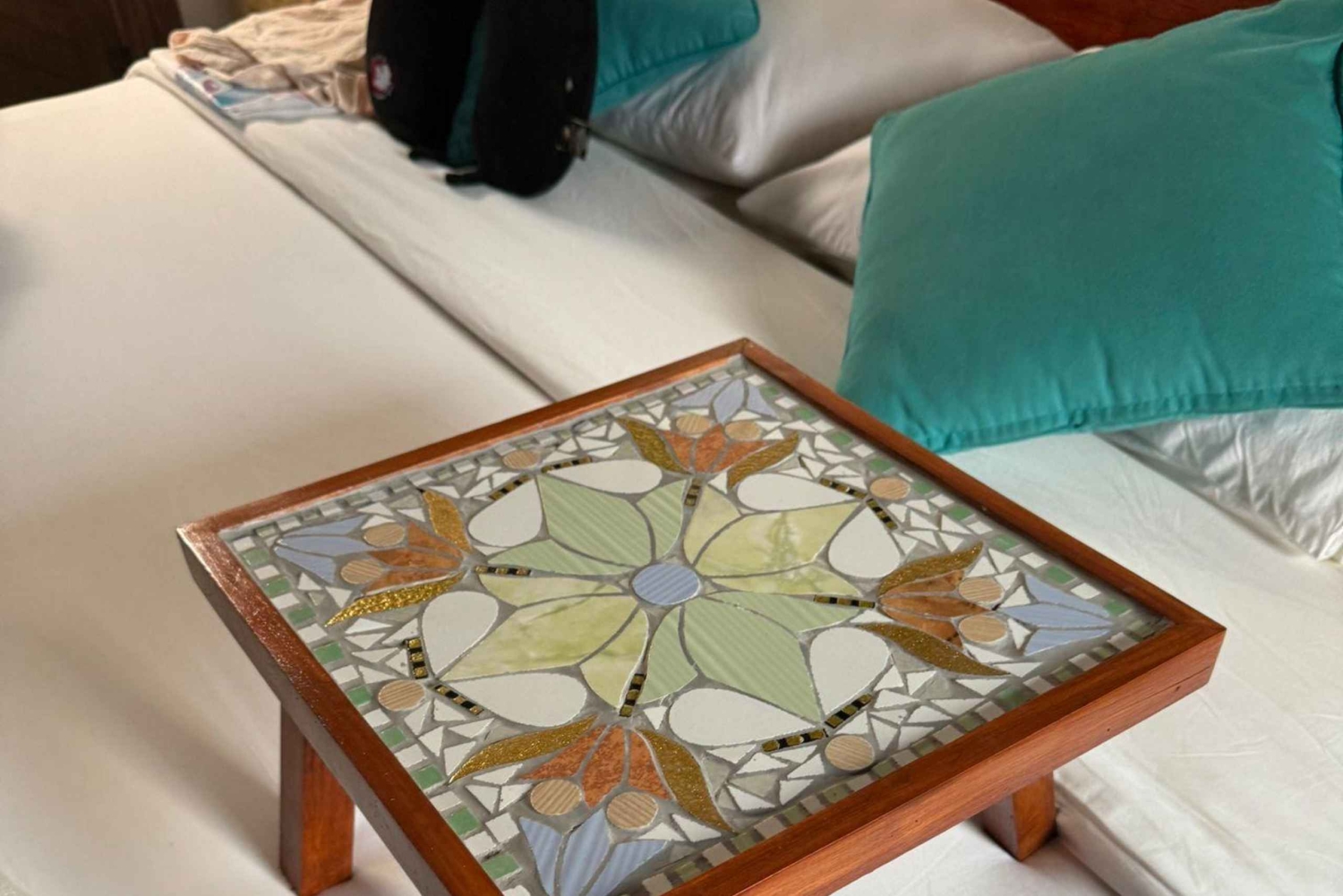Experience the joy of creating a special souvenir that you get to make yourself and enjoy forever with the guidance of a master artist in the field. The Sanctuary is by the river Balian next to the ocean in Lalanglinggah. This river is the cleanest, largest and most sacred in Bali. The workshop takes place in an Art Studio that was built 40 years ago to support the arts in Bali. It was originally a balinese dance school and artist center in West Bali. You will meet Shankari, the amazing artist behind all the mosaics in the house and you will learn every step that there is to create a mosaic table by yourself or with your partner. The number of people in the workshop depends on the number of people that show up that day. Either way you will get personal attention. Start by meeting your mentor and selecting your tiles. Develop your design before you apply any glue. Apply the glue and start putting in the tiles. You can get assistance at any point of the workshop. After your design is done there will be a break for afternoon tea where you can get balinese snacks and coffee, tea or juice while we wait for the glue to set. You will learn how to set the tile in grout (cement). And then it will be wrapped and you will get a carry-on bag to take with you. The dimensions of the table are 40x40cm with folding legs and when the product is finished it weighs 2kg. Components: unique handcut tiles, luxury golden teakwood, special formula glue and weatherproof plastic cement grout. The workshops start at 1pm until 5pm. We provide all materials and instructions. Afternoon tea includes a balinese snack and coffee, tea or juice.Includes
