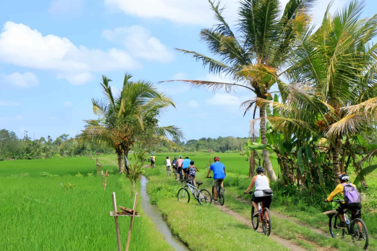 Your adventure starts the moment you’re picked up from your hotel and driven to a peaceful countryside village, far from Bali’s busy tourist spots in the Tabanan area. When you arrive a Balinese family welcomes you into their home for a light local brunch, a fun introduction to daily offerings and a chance to try traditional music. Then it’s time to hop on your bike! Your cycling guide helps you get comfortable and gives a simple, friendly briefing setting the tone for a relaxed, easy and super enjoyable experience. Once ready, you will start riding through Bali’s untouched nature. The first part of the route takes you through wide, photogenic rice fields where irrigation canals sparkle in the sun and farmers work just as they have for generations. The path is gentle, 90 % downhill, accessible and perfect for all levels, allowing you to enjoy the view without effort. As you progress, the scenery shifts into small village lanes lined with temples, family compounds and local homes. You witness authentic daily life everywhere you go, children greeting you with big smiles, women preparing offerings, farmers tending their crops. This is the Bali few travelers ever get to see. Your guide shares fascinating explanations in a dynamic, engaging way that brings each stop to life. Along the ride several short breaks are planned to let you take photos, enjoy the views and capture the best moments of the tour. One highlight is the coconut break: your guide opens a fresh coconut just for you, the perfect natural refreshment right in a typical balinese house. It’s a simple moment but one that feels genuinely special. On school days you will also stop at a local school. The visit is brief, respectful and incredibly enriching. You get to see students in their real daily environment and discover how Balinese children learn, play and grow. It’s a touching moment that adds personality and authenticity to the tour. The route then continues along scenic backroads surrounded by palm trees, bamboo forests and mountains as a background. The pace stays relaxed and comfortable with your guide adapting to the group. The atmosphere is fun, friendly and full of good energy perfect for families, couples or groups wanting to experience something real and refreshing. To complete the experience, the tour finishes with a delicious Balinese meal served in a peaceful natural setting. Imagine enjoying lunch overlooking rice fields, a quiet river : pure tranquility awaits you. Finally you’re driven back to your hotel with plenty of memories, great photos and the feeling of having discovered a side of Bali that goes way beyond the usual tourist highlights. This tour offers the perfect mix of nature, culture and relaxation with premium service, a comfortable pace and a truly authentic atmosphere. If you’re looking for an easy, enjoyable and unforgettable way to explore Bali’s countryside, this cycling experience delivers everything you expect and more.Includes