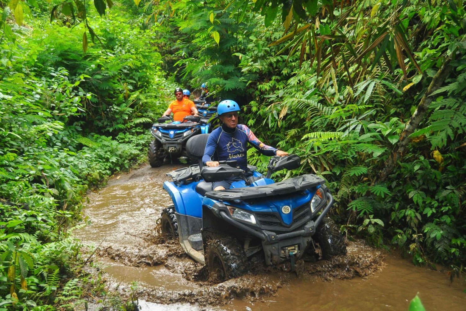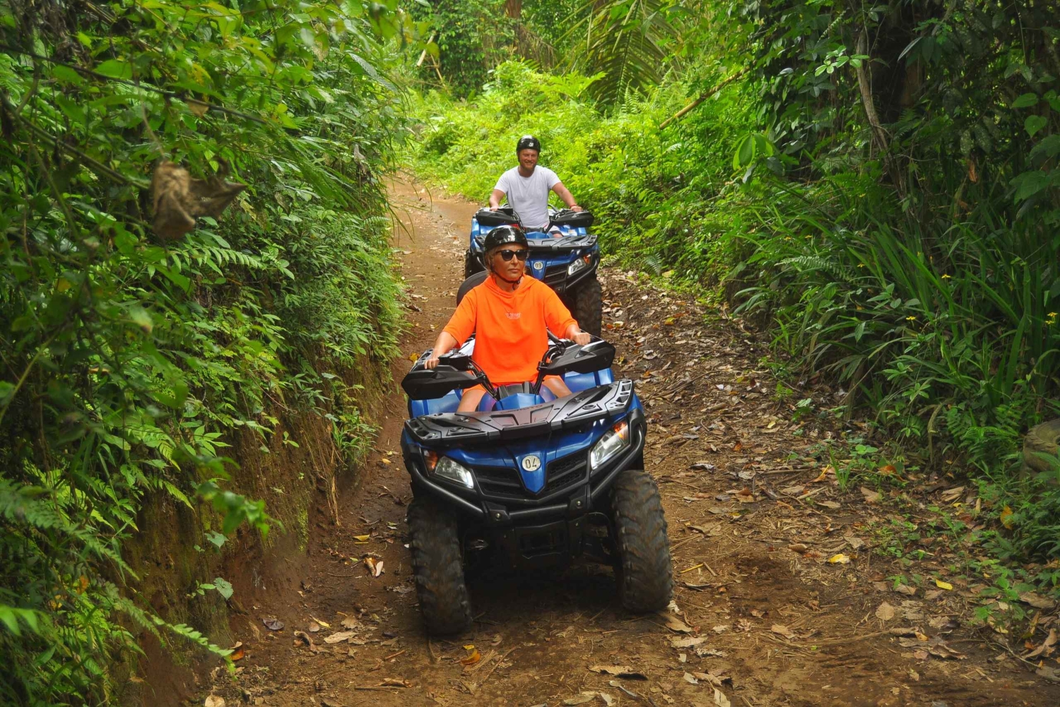 Explore the beauty of the inlands of Bali together with your beloved, sharing together one of our new fleet’s fully automatic big cc quad bikes (450cc) with independent suspension and power steering. The long wheelbase, side bars and back rest guarantee a comfortable ride while driving through rainforest with muddy tracks, between rice fields and plantations and passing a traditional Balinese village. After having watched an instruction video, followed by hands on instructions and training on the spot you will drive for an approx. two hours through the beautiful country side of Bali. Bali Quad Discovery tours is one of Bali’s adventure pioneers (since 2001) and we aim to offer our guests one of their highlights of their visit in Bali without compromising in safety. Our experienced and certified guides are very friendly and will accompany you during your journey. With currently over 25km of tracks we offer the longest off road experience in Bali. At Bali Quad Discovery Tours, we believe true adventure is not compatible with crowds! It’s an exclusive and personal experience. We don’t have customers, but guests and our guests are handled with more care than anywhere else for the best Bali Outdoor Adventure memories.Includes