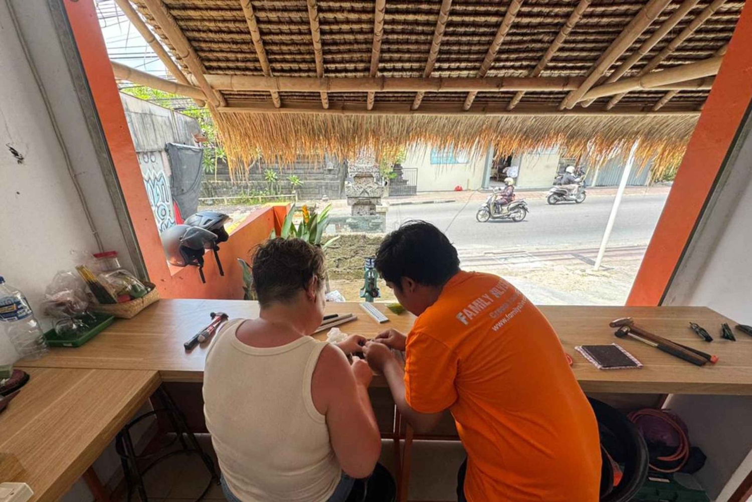 Silver Jewelry Making Class in Canggu Bali Make your dream of making jewelry come true in this silver jewelry making workshop. Whether it’s a ring, bracelet, pendant or other imaginative creation, enjoy a unique and learning experience for 2-3 hours. Learn from a team of dedicated and experienced Balinese silversmiths who will guide you through the process. Take home your own creation and cherish it as a souvenir of your holiday in Bali. Get ready to immerse yourself in the excitement of this workshop, where creativity and fun meet to make your dream jewelry come true. Learn all about silver jewelry making and how it has evolved over time in Bali. Using 5 - 7 grams of silver, create your own pair of earrings, ring or pendant. Work with our professional craftsmen to transform fresh silver into a polished work of art. It’s fun, challenging and a great way to spend your free time. we have the closest location to where you are, adjust your location to our silver class teaching location. We are in several places ready to serve you with quality and professionalism in working, the places we are located include Seminyak, Canggu, Kuta, Uluwatu, Sanur, Ubud, Sukawati, and Sidemen. We are waiting for your arrival to learn in the world of making jewelry with silver.Includes