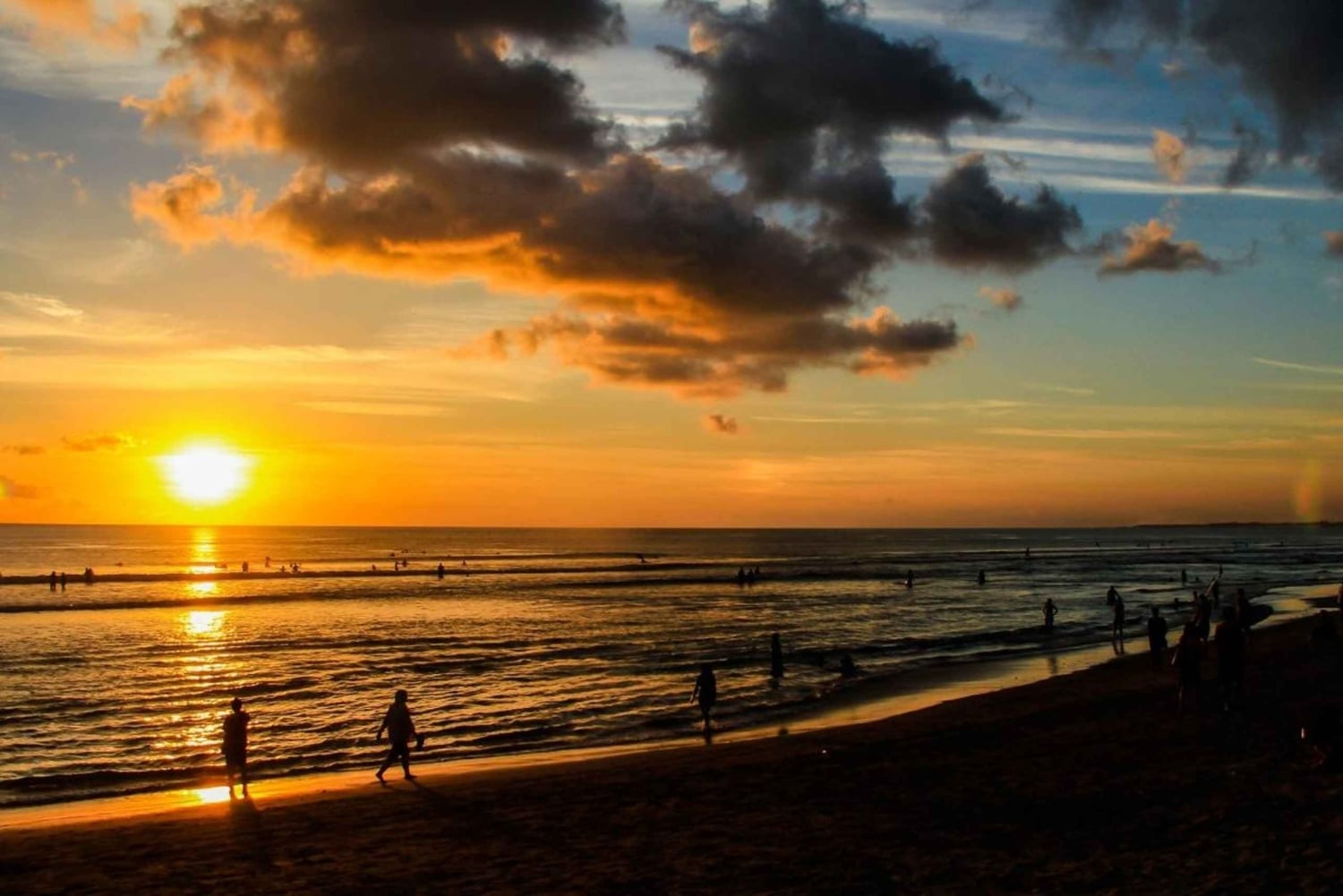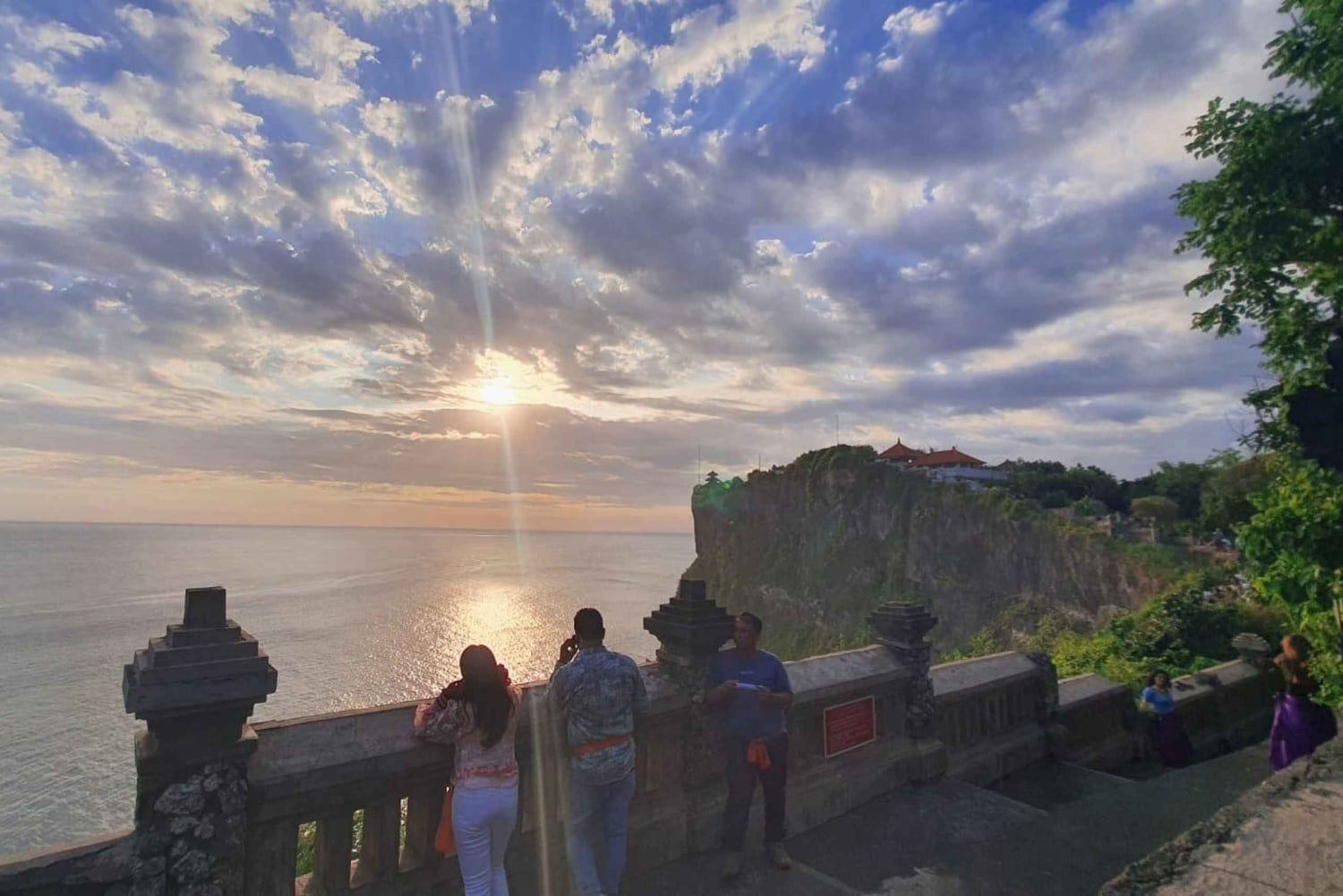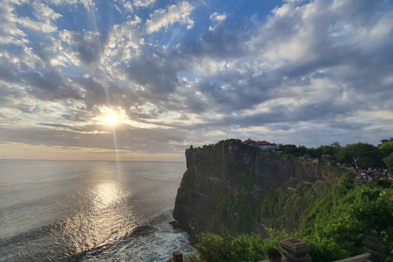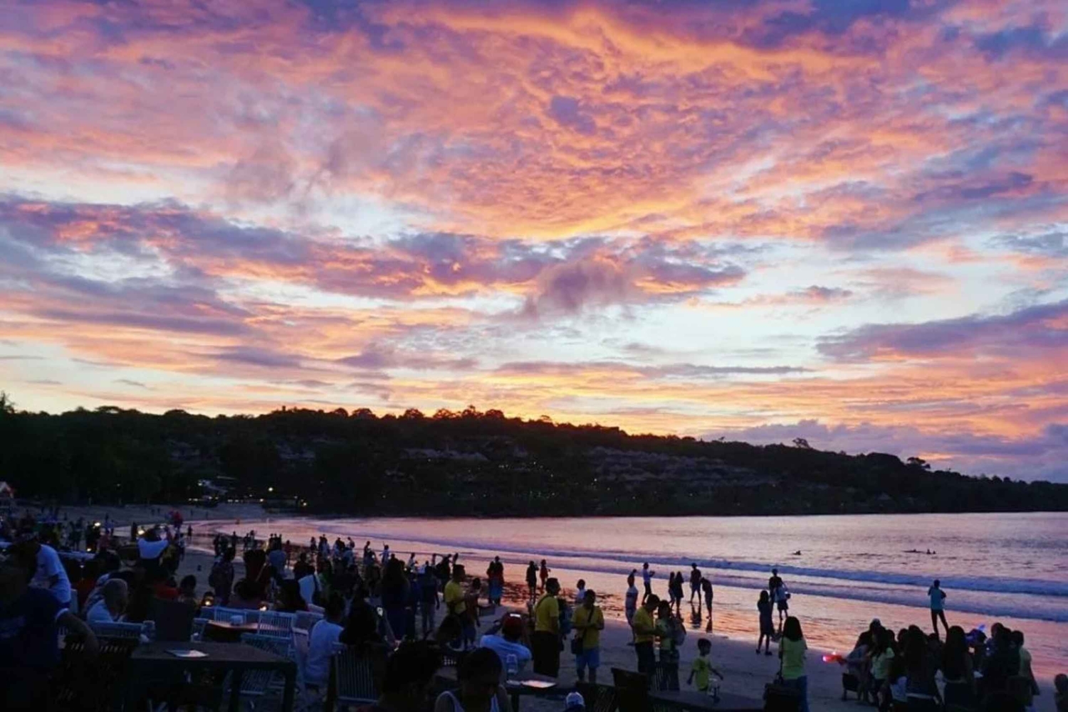 Experience the quintessential Bali sunset journey. This curated half-day tour takes you through the rugged beauty of the Bukit Peninsula, blending coastal exploration with ancient spiritual traditions and a world-class dining experience. Visit Suluban Beach (Blue Point), The Surfer’s Hidden GatewayStart your adventure by descending through a unique limestone crevice into a stunning cave opening. Known as a world-class surf break, Suluban offers a rugged, dramatic landscape where the turquoise tides meet ancient coral walls. It’s the perfect spot for photos and feeling the raw power of the Indian Ocean. and than continue our Tour to Pura Luhur Uluwatu, Majesty on the Edge Next, visit one of Bali's six key spiritual pillars. 11th-century temple offers panoramic views that stretch to the horizon. As you walk the cliffside paths, you'll witness the architectural harmony between man-made stone and natural wonder. During the sun set time there perform The Sunset Kecak Fire Dance, A Cultural Masterpiece As the sky turns golden, take your seat in the open-air amphitheater. Witness performers create a mesmerizing wall of sound using only their voices. The rhythmic 'Chak' chant, the hypnotic movement, and the fire-twirling finale—all performed as the sun sinks into the sea—create an atmosphere that is nothing short of electric. After finish to show we get back down town to Jimbaran Bay, A Feast Under the StarsEnd your night at the famous Jimbaran Bay. Swap your shoes for the sand and enjoy a candlelit seafood dinner. Indulge in a platter of freshly caught snapper, prawns, and squid, grilled over coconut husks and served with traditional Balinese sambal. It is the ultimate romantic conclusion to a day of discovery.Includes