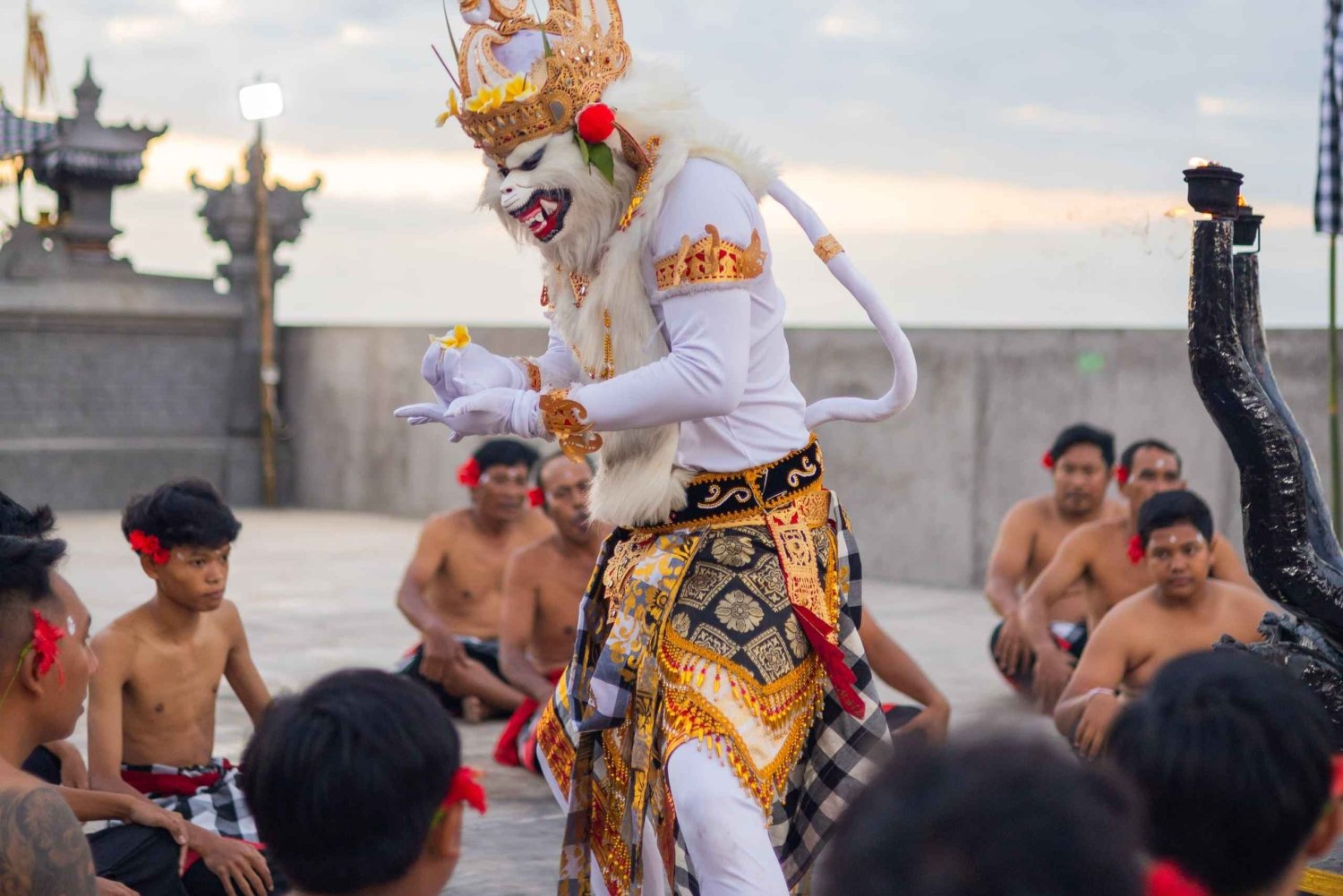 Begin your adventure with a convenient hotel pickup in Bali and travel in comfort to Uluwatu Temple, dramatically perched on a 70-meter cliff overlooking the Indian Ocean. On arrival, receive a traditional sarong and sash to respectfully enter the sacred grounds. Stroll through the temple complex at your own pace, admire the centuries-old Balinese architecture, and soak in endless ocean views. Keep an eye out for the temple’s playful resident monkeys, known for their mischievous tricks. After exploring the temple, continue by vehicle to the Karang Boma Cliff amphitheater, a new stage located right on the edge of the ocean. This open-air venue offers a less crowded experience, with panoramic views of the sea and sunset. As the sky glows with evening colors, settle in for the unforgettable Kecak Fire Dance. Be mesmerized by the rhythmic “cak-cak-cak” chants of the male choir, who form a moving circle to narrate scenes from the Ramayana epic. Watch as Prince Rama battles the demon King Ravana to rescue Princess Sita, aided by the white monkey god Hanuman. The performance reaches its climax with a fiery, dramatic finale that will leave you spellbound. At the end of the show, your driver will be waiting to take you back. If you’ve selected the dinner add-on, continue to Jimbaran Bay and enjoy a romantic seafood barbecue on the beach, with the gentle sound of waves completing the perfect evening.Includes