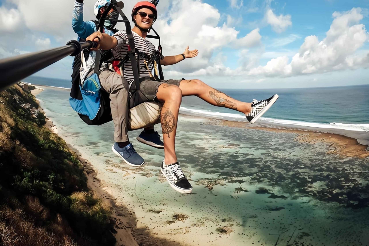 Survolez la péninsule méridionale de Bali lors d'une aventure exaltante en parapente tandem. Profitez d'une vue imprenable sur l'océan Indien, les falaises de calcaire et la ligne d'horizon de Bali. Votre voyage commence par une prise en charge à l'hôtel, suivie d'un briefing de sécurité par votre pilote expérimenté à l'arrivée. Après vous être équipé du matériel nécessaire, vous ressentirez le frisson de vous élever comme un aigle. Survolez gracieusement l'île, admirez le sable blanc de l'emblématique plage de Pandawa et le temple d'Uluwatu perché sur les falaises. Découvrez le littoral époustouflant et les joyaux cachés de Bali depuis le ciel, en planant, en vous balançant et en manœuvrant sans effort dans le ciel. Une fois l'aventure terminée, détendez-vous et profitez d'un retour confortable à votre hôtel.Includes