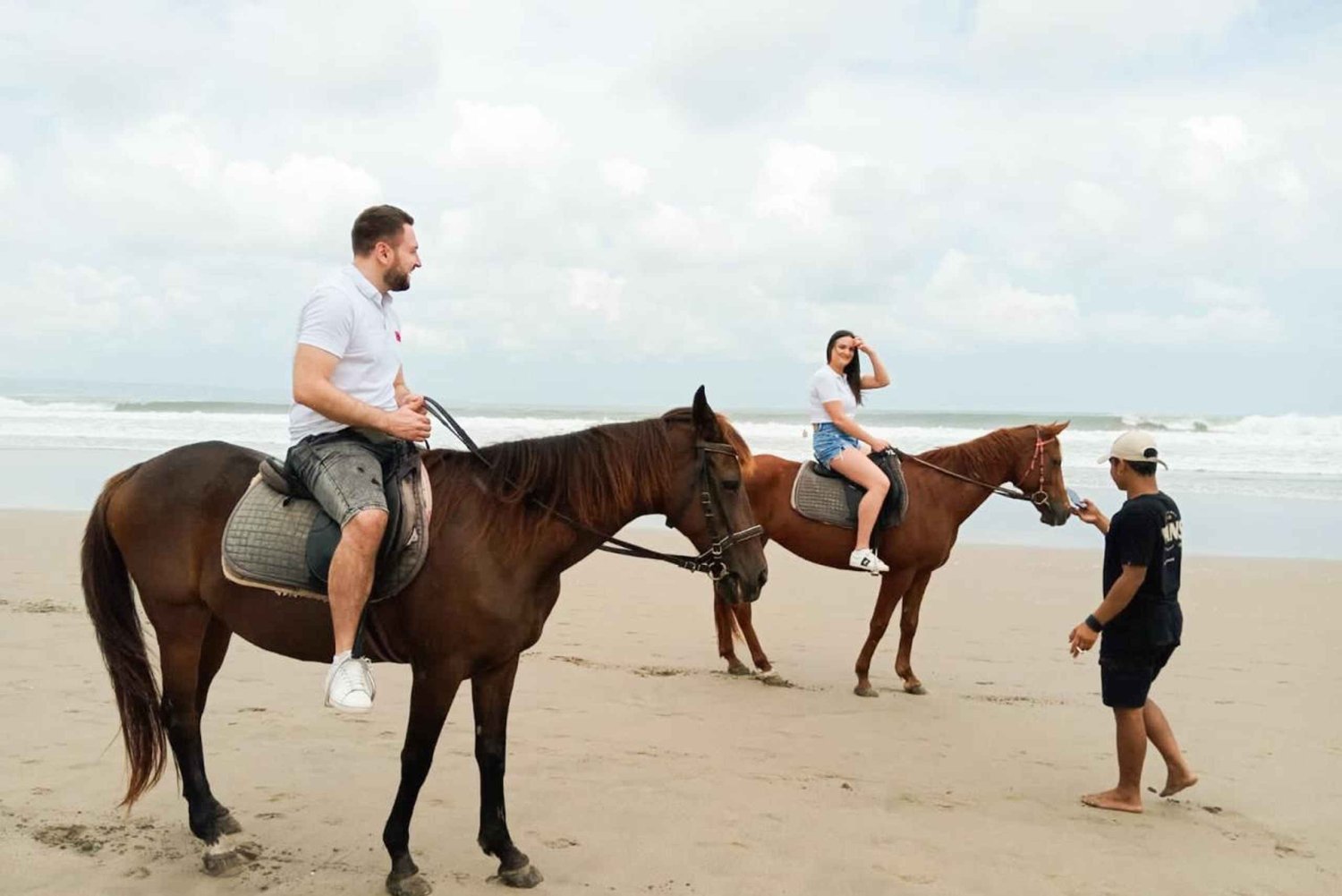 注意:最大体重は85kgです。85kgを超える場合は乗馬ができません。返金はございません。 この体験は、喧騒から離れた平和な逃避行を提供し、美しいセミニャックビーチを、波の音に包まれながら乗馬できます。経験豊富な現地ガイドが案内する乗馬ツアーは、初心者からベテランまで、あらゆるレベルに対応しています。よく訓練された優しい馬とペアになり、緑豊かな田園地帯、魅力的なバリの村々を通り抜け、最後にセミニャックの絶景海岸線へと続く景観豊かなコースを散策します。ビーチをトロットやキャンターで駆け抜ける際、特に日没時には、景色が本当に忘れられないほど美しく、ロマンチックな旅行や家族旅行に最適です。リラックスした乗馬体験や興奮するビーチ体験を求めている方にも、セミニャックの乗馬ツアーは自然、文化、乗馬の楽しさを融合した体験を提供します。安全装備と指導が提供され、安全で楽しい体験を保証します。Includes
