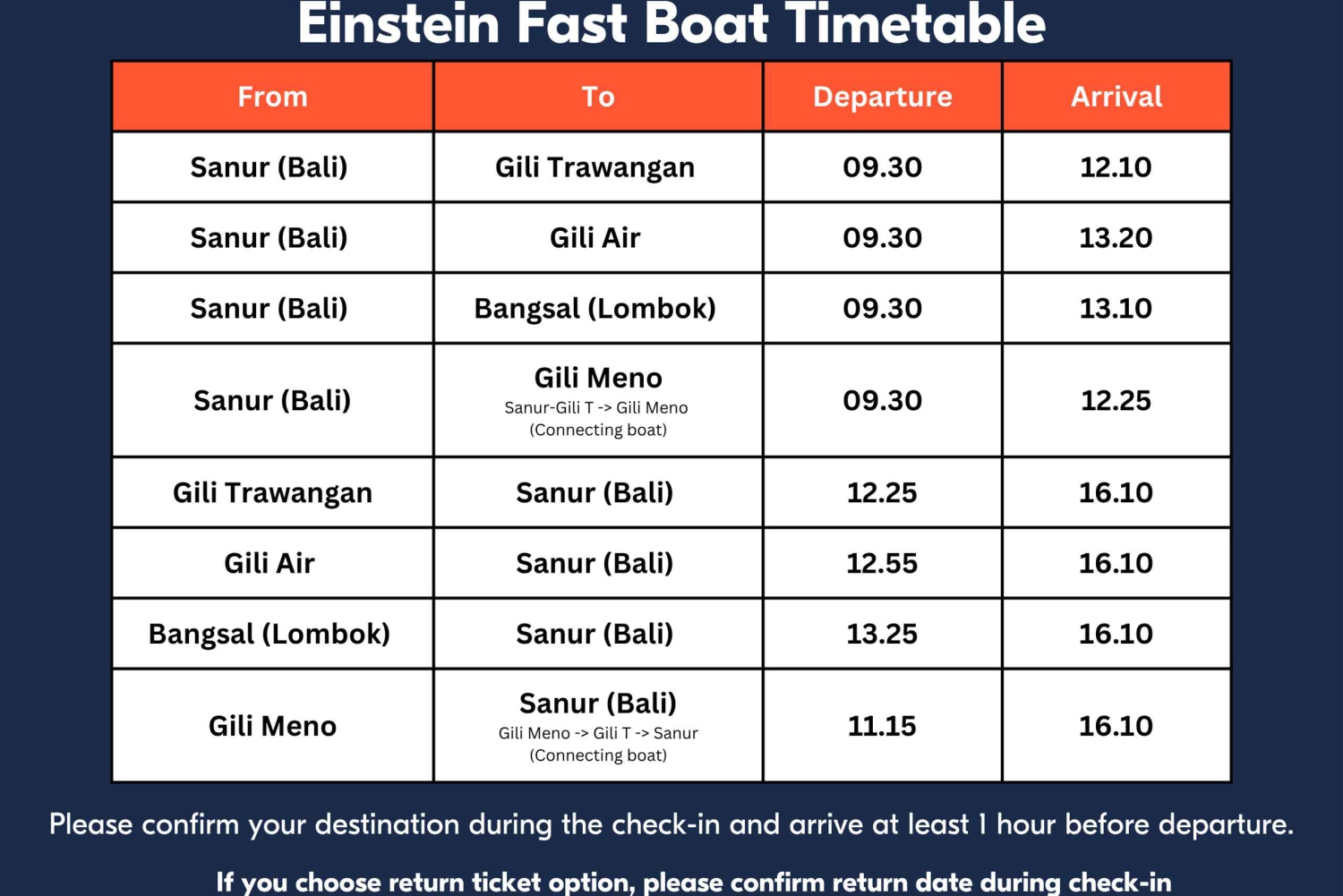 バリ島-ギリ島間の片道または往復高速ボート送迎。 合計25kg(55ポンド)の手荷物2個まで無料。超過手荷物は有料となります。 船上でのスナックとミネラルウォーターの無料サービス。 ご搭乗時に冷えたタオルのサービス。 オフィスと船内では無料Wi-Fiをご利用いただけます。 エアコン完備の快適なキャビン。 機内トイレ 総合旅客保険 全島でのポーターサービス。 フレンドリーで、資格を持ち、英語を話すクルー。Important Information