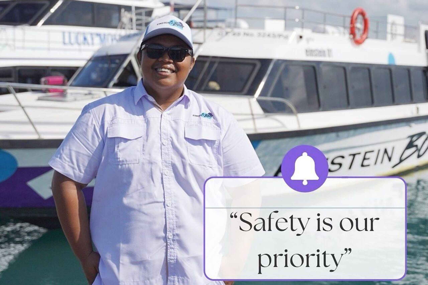 - ご出発の1時間前までに所定の場所でチェックインをお済ませください。 港のゲートに進む前に、チケットカウンターでEチケットの認証が必要です。 3歳未満のお子様、65歳以上の成人、妊娠中の方、心臓や背中に疾患のある方にはお勧めできません。妊娠中の方、健康状態に問題がある方は免責事項に署名してください。 手荷物は2個まで、合計25kg(55ポンド)まで無料。超過手荷物は有料です。 国際安全基準、認定乗務員、旅客保険により、安全な旅をお約束します。