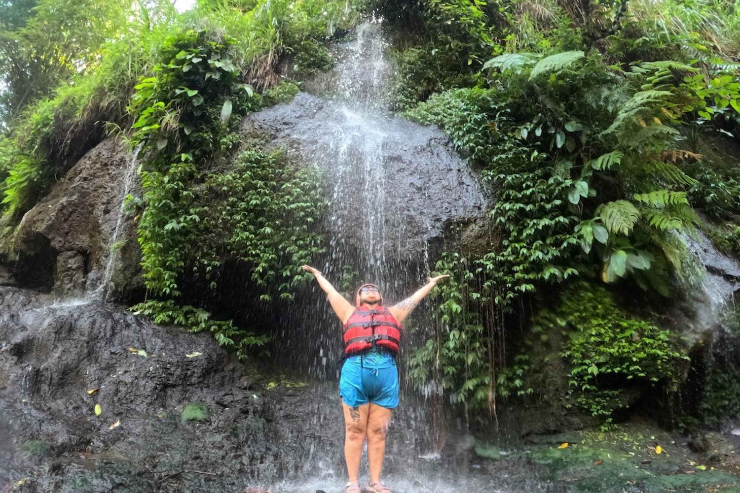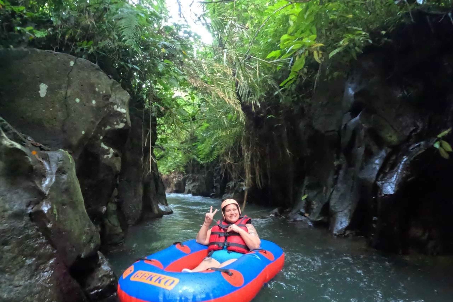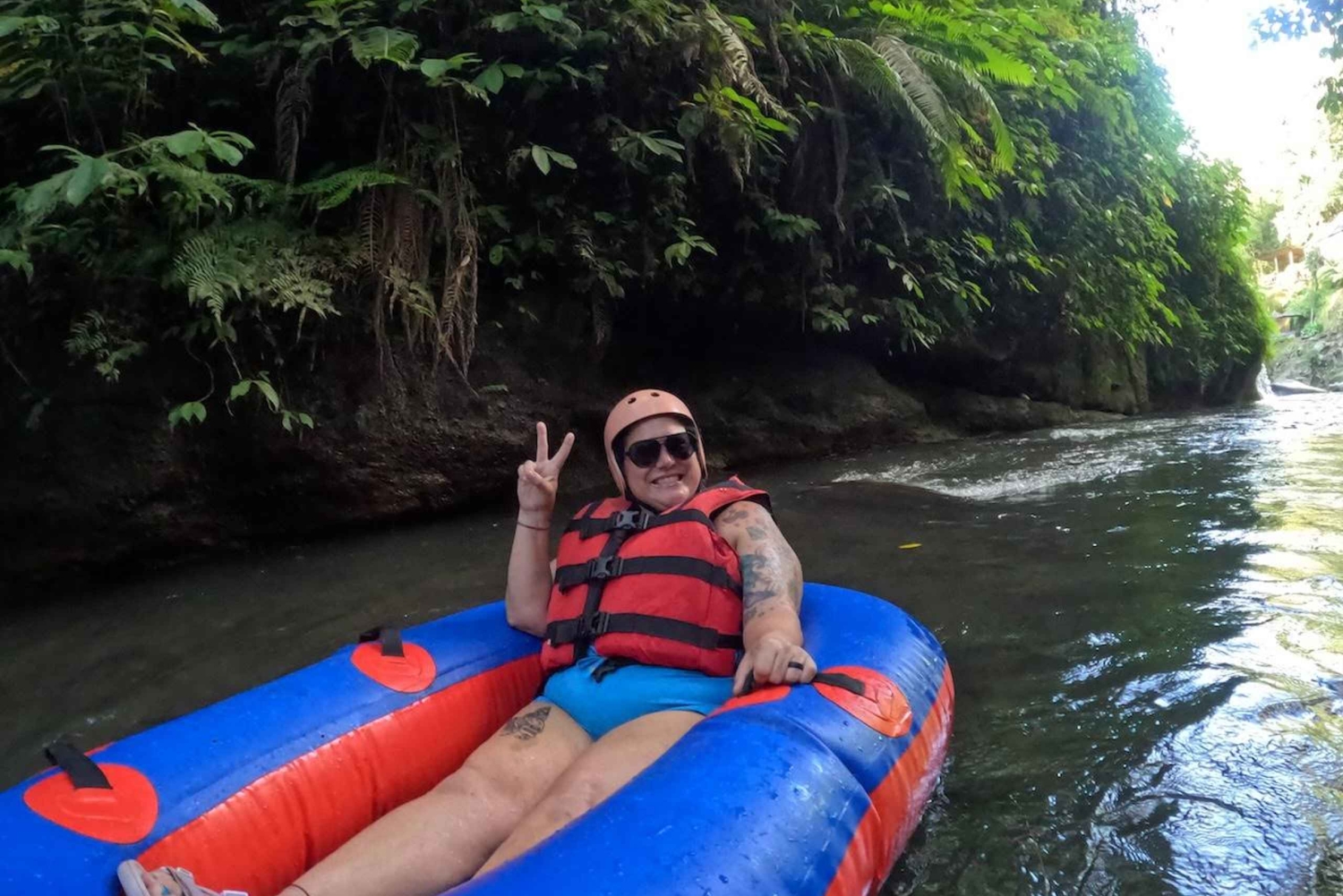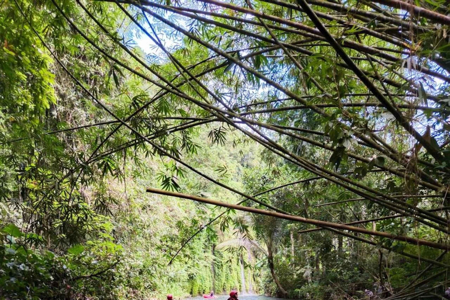 Privat bil fra hotell i Canggu, Seminyak, Legian, Kuta, Ubud, Sanur, Nusa Dua, Jimbaran, Benoa, Sanur Terrengsykkel for sykling Fersk kokosnøtt Enkel flåte Dusjer og håndklær på River Tubing-stedet Flaske med vann og kaldt håndkle per personEasy cancellation