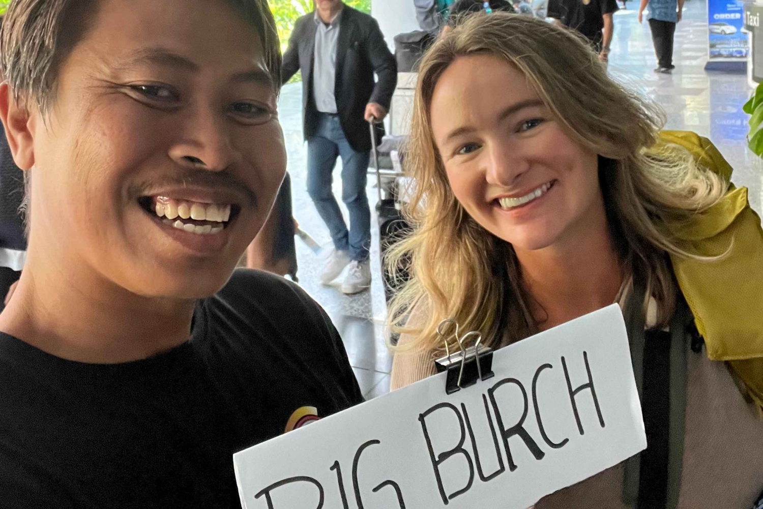 - Hvis du befinner deg på Ngurah Rai lufthavn, må du vente på oss ved ankomstporten. For enkelhets skyld vil den engelsktalende sjåføren vente på deg i flyplassens ankomstområde, lett identifiserbart med et skilt som viser navnet ditt. Hvis du befinner deg i Uluwatu-området, kan du vente på sjåføren i lobbyen på hotellet ditt.