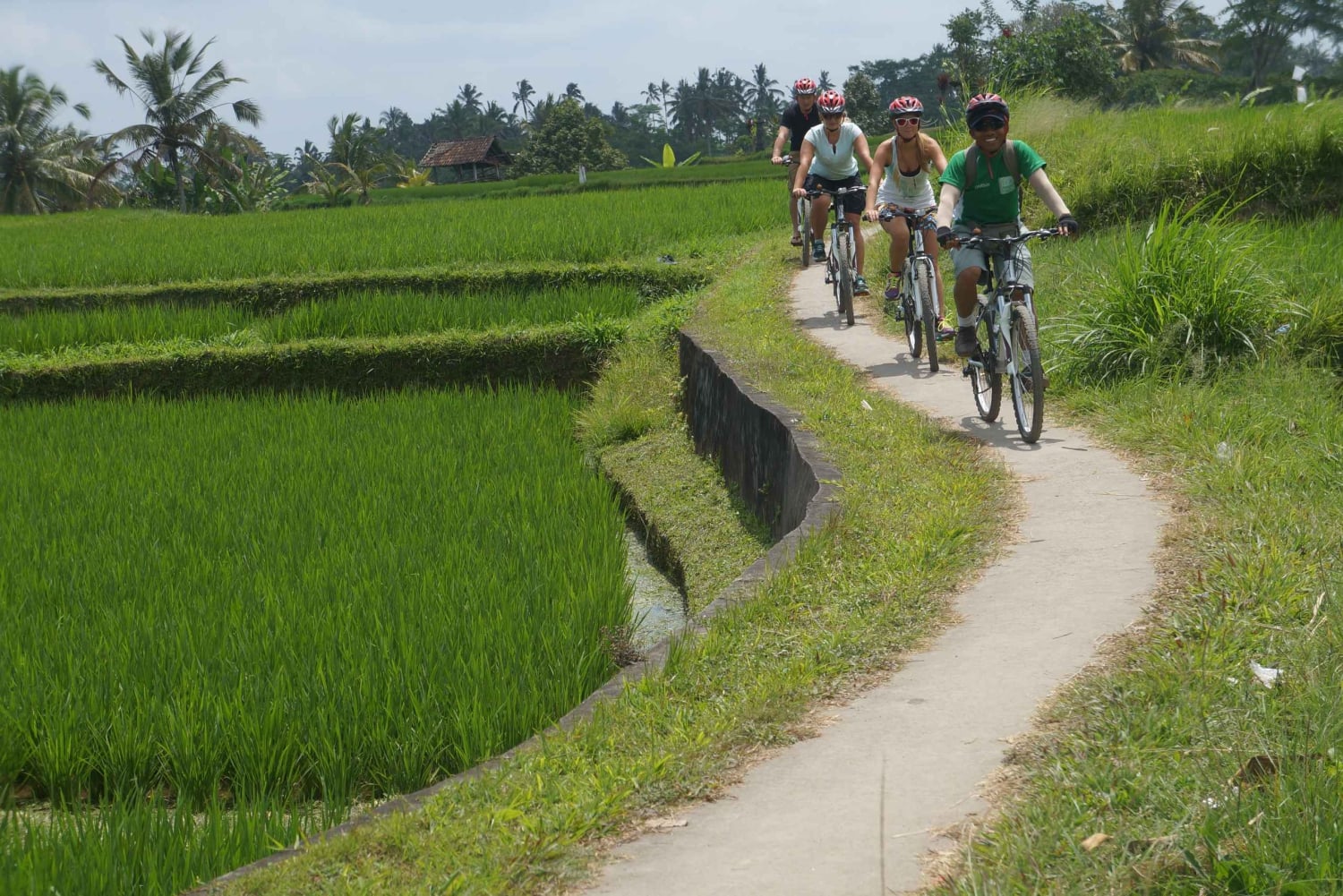 Wycieczka rozpoczyna się od odbioru w hotelu, skąd pojedziesz do punktu początkowego w wiosce Abuan Kintamani. Szybkie wyjaśnienie standardów bezpieczeństwa z przewodników przed jazdą na rowerze. Trasa jest bardzo ciekawa, ponieważ prowadzi przez kilka wiosek, ogrodów i pól ryżowych około 22 km w większości łagodnym zjazdem. Po drodze jest kilka przystanków, które pozwolą nam poznać i zobaczyć rutyny lokalnych mieszkańców w ich prawdziwym życiu. Pierwszy przystanek znajduje się w wężu balijskim, gdzie przewodnik wyjaśni kilka informacji na temat balijskiego związku, drugi w ogrodzie palmowym na przerwę na kawę z balijskim ciastem. Trzeci znajduje się przed historyczną świątynią Gunung Raung w wiosce Taro, a ostatni znajduje się w wiosce Bresela, gdzie znajduje się najpiękniejszy widok na pola ryżowe. Wycieczka kończy się obiadem w kawiarni Greenkubu położonej na środku pola ryżowego.Includes