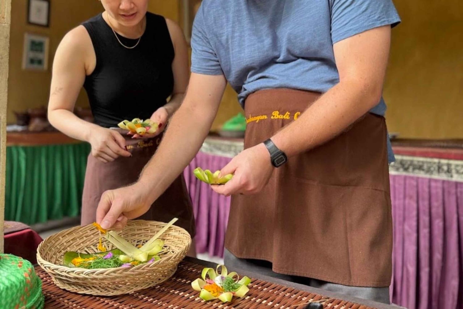 Lär dig att laga traditionella balinesiska rätter i en naturskön miljö med utsikt över risfält i Ubud. Upptäck konsten att göra Canang, en traditionell gåva, och fördjupa dig i den lokala kulturen.